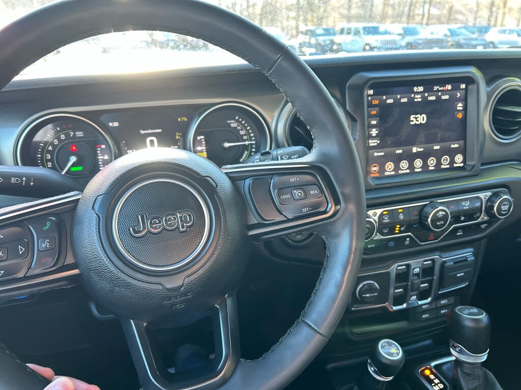 Media Hub - 2 USBs (Both Charge Only), Rear Window Defroster, Remote USB Port - Charge Only, 115-Volt Auxiliary Power Outlet, 8.4 Radio Group, Off-Road Info Pages, SiriusXM Traffic Plus, HD Radio, Radio: Uconnect 4C Nav w/8.4 Display, For Details, Visit DriveUconnect.com, Rear View Auto Dim Mirror, 1-Year SiriusXM Guardian Trial, GPS Navigation, SiriusXM Travel Link, Emergency/Assistance Call, 8.4 Touchscreen Display, Rear Window Wiper/Washer, Removable Rear Quarter Windows, Power Top Quarter Window Storage Bag, Sky 1-Touch Power Top, Console Bin Task Light, Heated Steering Wheel, Remote Start System, Heated Front Seats, Class II Receiver Hitch, 700 Amp Maintenance Free Battery, 7 & 4 Pin Wiring Harness, Auxiliary Switches, Universal Garage Door Opener, Engine: 2.0L I4 DOHC DI Turbo PHEV, Transmission: 8-Speed Auto 8P75PH PHEV, Willys, 4xe 4-Wheel Drive Swing Gate Decal, Willys 4xe Hood Decal, Black Grille, MOPAR All-Weather Floor Mats, Rock Protection Sill Rails, 97 MPH Vehicle Max Speed Calibration, Anti-Spin Differential Rear Axle, Molded-In-Color Fender Flares (2-Piece), Front LED Fog Lamps, LED Premium Reflector Headlamps, LED Headlamp & Fog Lamp Group, (STD), (STD). Privacy Glass, Keyless Entry, Child Safety Locks, Steering Wheel Controls. Serviced here, Non-Smoker vehicle