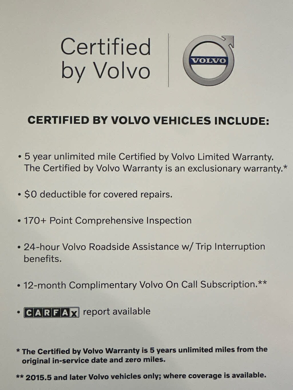 Each vehicle has to pass a rigorous 170-Point Comprehensive Inspection and Reconditioning, $0 Deductible for covered warranty repairs, Volvo Roadside Assistance is included for the duration of the vehicles warranty, Vehicle History Report with Buyback Guarantee, 5-year/unlimited mileage Warranty from the original in service date, Complimentary 3-month trial subscription to SiriusXM satellite radio